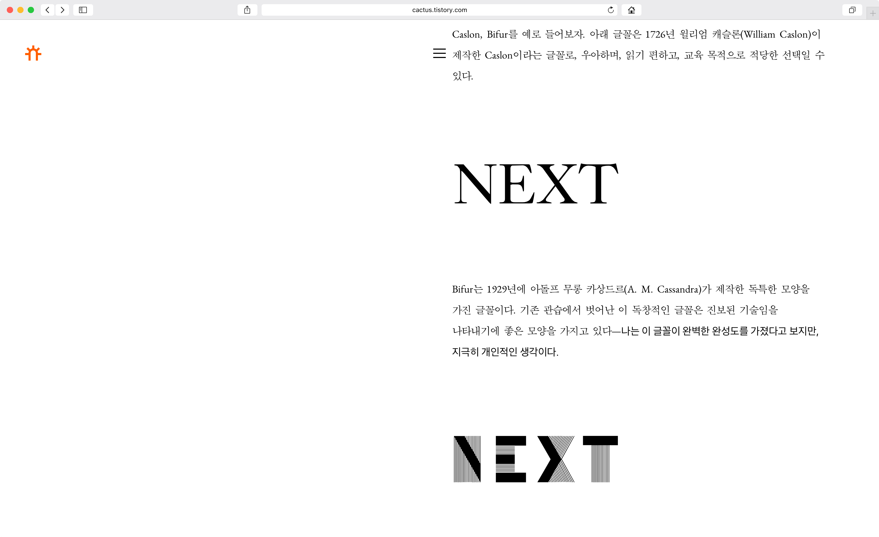 웹에서 한글과 영어를 섞어 쓰다보면 한글 글꼴 속 라틴 문자는 어딘가 외국에서는 볼 수 없는 분위기가 풍긴다. 일반적인 웹 환경에서는 책에서의 다국어 섞어짜기처럼 영문과 한글을 나누면서까지 공들여 디자인하지 않고, 운영체제마다 지원하는 글꼴의 종류 또한 다양하기 때문에 웹에서 아름다운 타이포그래피를 표현하기는 어려운 문제였다. 한 예로, macOS의 기본 글꼴 중에 소설책에 주로 쓰이는 바탕체 글꼴인 SM신명조와 같은 계보인 애플명조라는 글꼴을 웹에 적용하면, 지나치게 넓은 애플명조의 기본 자간을 읽기 편하게 조정하면 같은 글꼴에서 자간이 넓지 않은 영문의 자간도 같이 좁아져 영문은 읽기 어려운 수준이 되는 것이다. 이전 스킨에서는 이를 수작업으로 영문이 들어간 부분에 속성을 추가했었는데, 이번 스킨에서는 multilingual.js라는 다국어 섞어짜기를 제어하는 자바스크립트 라이브러리를 이용해 라틴과 한글, 문장부호, 숫자를 분리해 각 문자에 맞는 속성을 자동으로 적용하게 했다. 하지만 이렇게 애플명조만을 위한 속성을 적용하면 애플명조가 없는 Windows에서는 애플명조를 대체하는 글꼴인 제주명조도 같이 읽기 어렵게 자간이 좁아지기 때문에, FontUnstack라는 jQuery 라이브러리를 이용해 화면에 출력된 글꼴을 인식하고, 각 글꼴과 문자별로 속성을 적용했다. 두 라이브러리 덕분에 어느 운영체제에서 어느 문자를 보든 아름답고 읽기 편하게 보여준다.